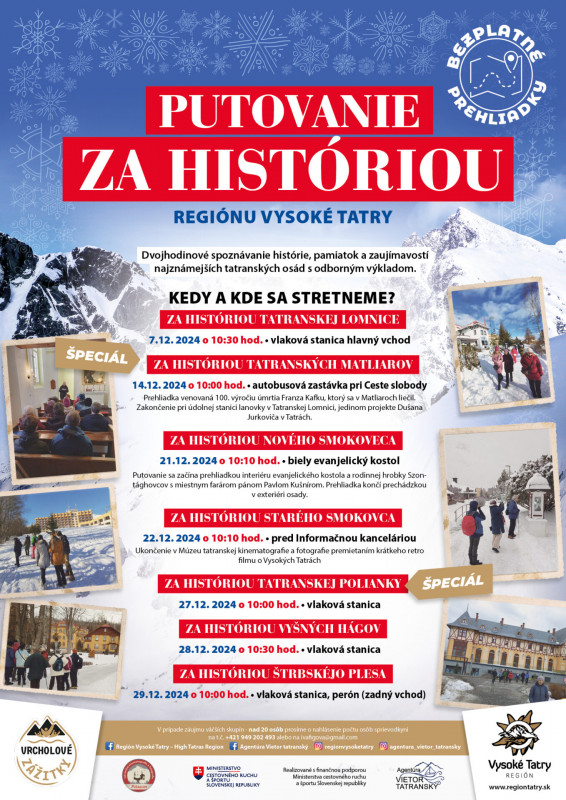 Spoznajte históriu, pamiatky a zaujímavosti najznámejších tatranských osád počas kultúrno – turistickej prechádzky v mesiaci DECEMBER s profesionálnou turistickou sprievodkyňou, ktorá trvá približne 2 hodiny. VSTUP NA PUTOVANIE JE VOĽNÝ.