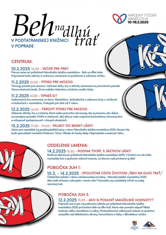 Akvivity, ktoré sú súčasťou Národného týždňa manželstva 2025 – Beh na dlhú trať. Podujatia sa uskutočnia v Centre v Podtaranskej knižnici v Poprade, aj na pobočkách JUH 1, JUH 3 a Oddelenie umenia v Spišskej Sobote.