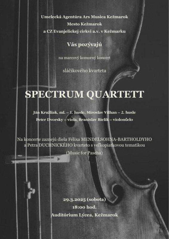 Komorný koncert sláčikového kvarteta SPECTRUM QUARTET. Na koncerte zaznejú diela Félixa Mendelsonha-Bartoldyho a Petra Duchnického kvarteto s veľkopiatkovou tematikou.