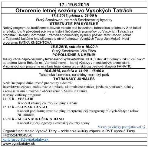 < aktuálny týždeň zľavy na tatrami.sk > Letnú sezónu vo Vysokých Tatrách otvoríme počas víkendu 17. - 19. júna 2016 v Starom Smokovci a v Tatranskej Lomnici.Program je nasledovný: publikované: 18.05.2016 Diskusia Please enable JavaScript to view the comments powered by Disqus.