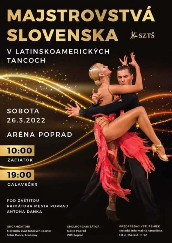 Slovenský zväz tanečných športov, Solus Dance Academy, Mesto Poprad a Základná umelecká škola Poprad vás pozývajú na Majstrovstvá Slovenska v latinskoamerických tancoch, ktoré sa uskutočnia v sobotu 26. marca 2022 v Aréna Poprad.