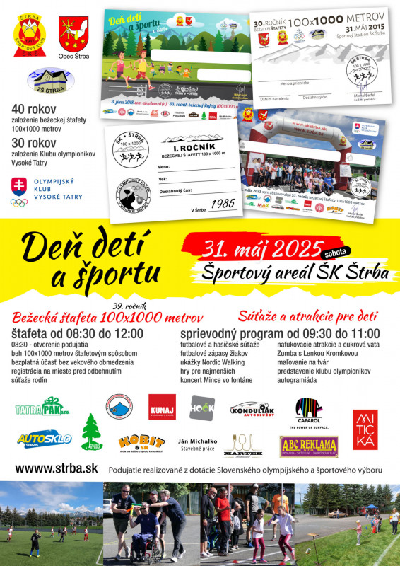 Deň detí a športu odštartuje v sobotu 31. mája 2025 v Športovom areáli ŠK Štrba. Je to rodinne orientované podujatie, ktorého cieľom je zapojiť návštevníkov do rôznych športových disciplín.