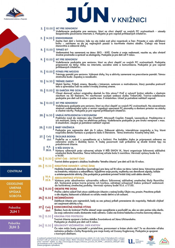 Pozývame Vás na aktivity pre deti i dospelých v mesiaci jún, ktoré sa uskutočnia v Podtatranskej knižnici či už v Centre (Podtatranská 1548/1) alebo na pobočkách Juh 1, Juh 3 a Spišská Sobota.