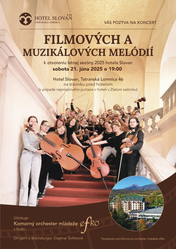 Koncert k otvorenie letnej sezóny v hoteli Slovan v Tatranskej Lomnici. Už túto sobotu, 21.06.2025, o 19.00 na trávniku pred hotelom zaznejú známe i menej známe filmové melódie. V prípade nepriaznivého počasia v hoteli v Zlatom salóniku.