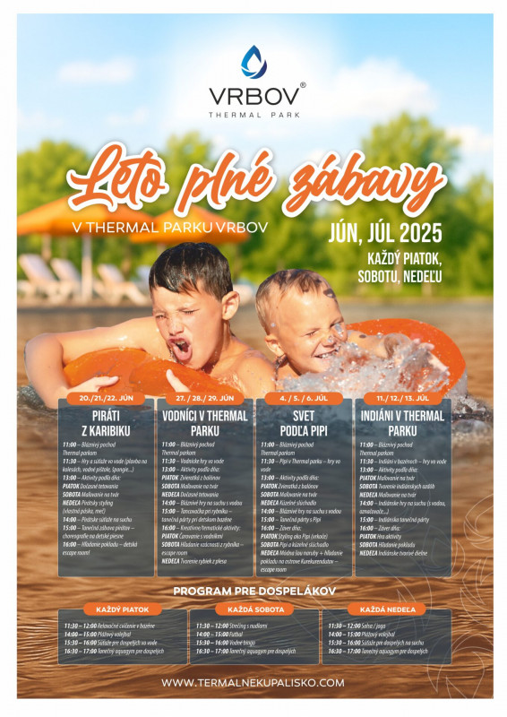 Leto v Thermal parku Vrbov bude tento rok plné pohybu, smiechu a nezabudnuteľných zážitkov. Každý piatok, sobotu a nedeľu sme pre vás pripravili tematický animačný program pre deti aj dospelých. Tešiť sa môžete na obľúbené postavičky, zábavné súťaže, vodné hry, tvorivé dielne a tanečné párty.
