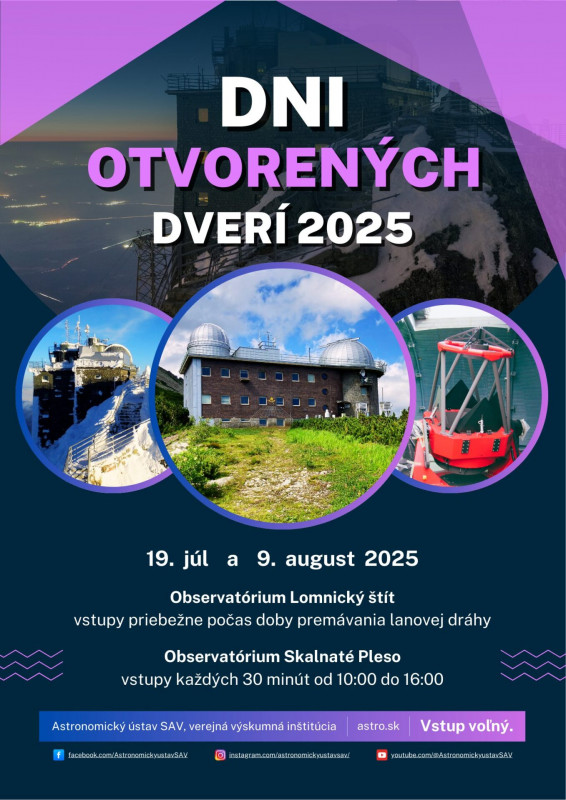 Astronomický ústav Slovenskej Akadémie vied, v. v. i., Vás srdečne pozýva na Dni otvorených dverí na vysokohorských observatóriách na Lomnickom štíte a Skalnatom Plese, ktoré sa uskutočnia v dňoch 19.7. a 9.8.2025.