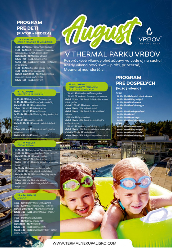 V Thermal parku Vrbov vás počas celého augusta čakajú tematické víkendy pre deti aj dospelých. Každý víkend prinesie nový rozprávkový svet – od pirátov cez princezné až po Moanu a doby ľadovej. Čakajú vás súťaže, vodné hry, kreatívne dielne, tancovačky aj penová párty. Program je v cene vstupného.