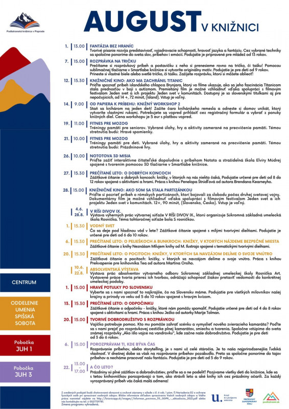 Srdečne vás pozývame na augustové podujatia, ktoré sa uskutočnia v priestoroch našej knižnice v Centre na sídlisku Západ, v Oddelení umenia v Spišskej Sobote, v pobočkách JUH1, JUH3.