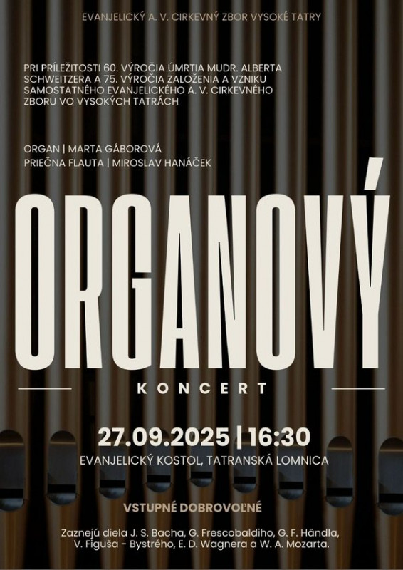 < aktuálny týždeň zľavy na tatrami.sk > Organový koncert v Evanjelickom kostole v Tatranskej Lomnici. Vstupné dobrovoľné. Zdroj: regiontatry.sk publikované: 01.09.2025 Diskusia Please enable JavaScript to view the comments powered by Disqus.
