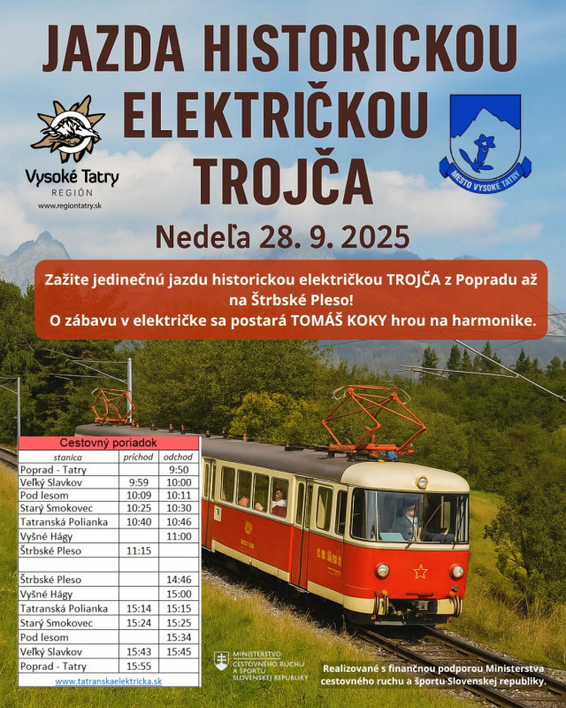 Zažite nezabudnuteľnú jazdu historickou električkou TROJČA, ktorá vás zavedie z Popradu až na Štrbské Pleso. Táto jedinečná jazda ponúka nielen nádherné výhľady na Vysoké Tatry, ale aj výnimočnú historickú atmosféru. O dobrú náladu sa postará hudobník Tomáš Koky, ktorý cestu spríjemní hrou na harmonike.
