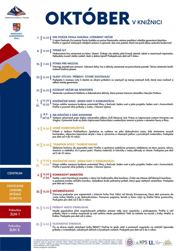 Pozývame Vás na podujatia pre deti i dospelých v mesiaci október, ktoré sa uskutočnia v Podtatranskej knižnici v Poprade – v Centre na sídlisku Západ i na pobočkách v Sp. Sobote, JUHU 1, JUHU 3.