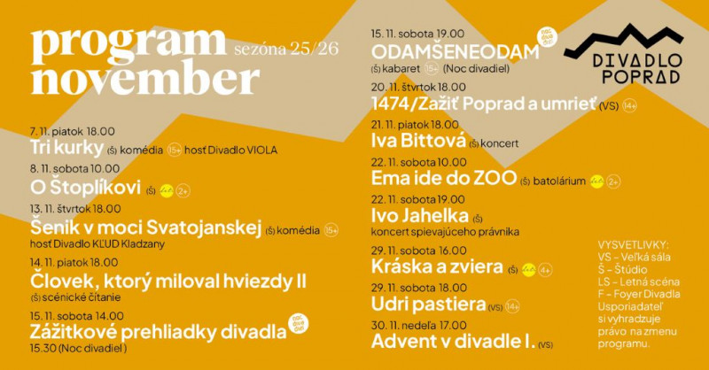 < aktuálny týždeň zľavy na tatrami.sk > Program Divadla Poprad na november 2025. Zdroj: regiontatry.sk publikované: 20.10.2025 Diskusia Please enable JavaScript to view the comments powered by Disqus.