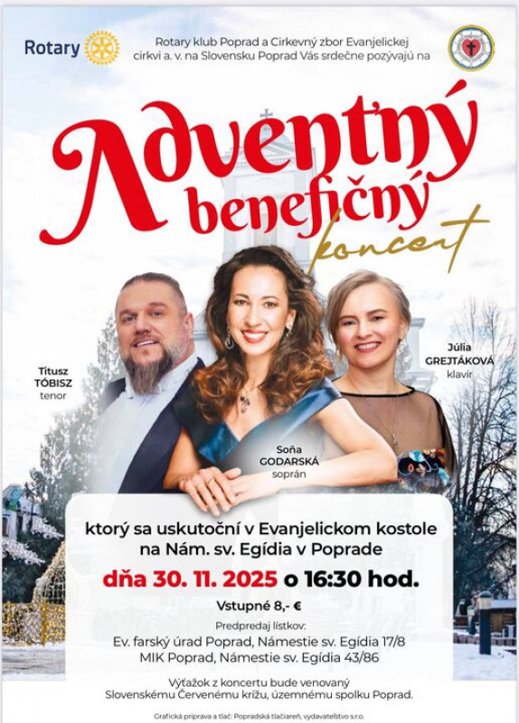 ADVENTNÝ BENEFIČNÝ KONCERT / Evanjelický kostol na Nám. sv. Egídia v Poprade / nedeľa 30,11.2025 o 16:30 hodine / Vstupné: 8,- € Soňa Godárska – soprán Titusz Tóbisz – tenor Júlia Grejtáková – klavír