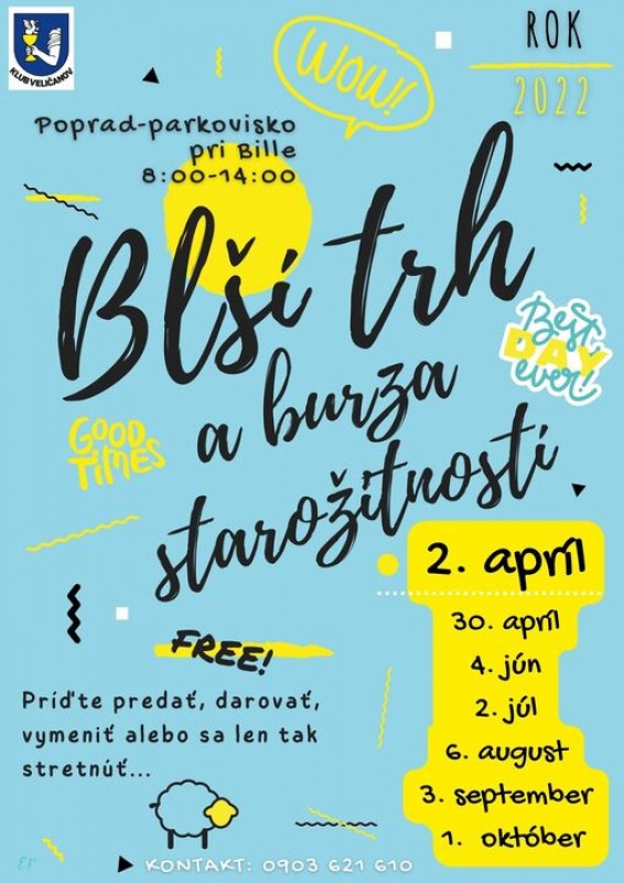 Blší trh a burza starožitností 2022, ktorú už šiesty rok organizuje Klub Veličanov v Poprade, sa uskutoční každú prvú sobotu v mesiaci od apríla až do októbra na parkovisku pri Bille.