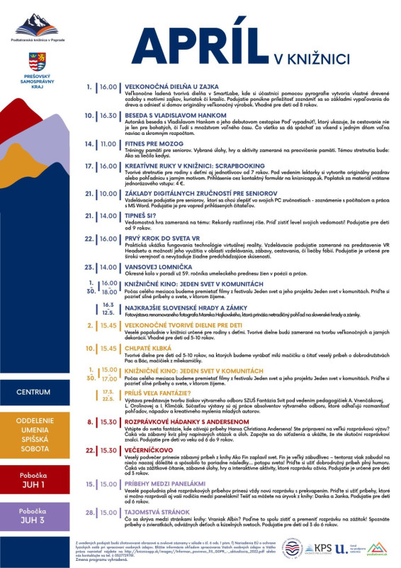Srdečne pozývame deti i dospelých na rôzne aktivitiy do knižnice v Centre (sídlisko Západ), na pobočky Oddelenie umenia v Spišskej Sobote a JUH 1, JUH 3.