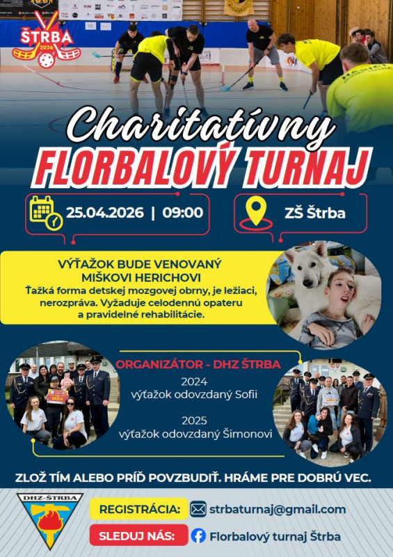 Charitatívny florbalový turnaj 25.4.2026, 9:00, zš štrba zlož tím alebo príď povzbudiť. výťažok bude venovaný miškovi herichovi – ťažká forma detsekj mozgovej obrny, je ležiaci, nerozpráva, vyžaduje celodennú opateru a pravidelné rehabilitácie. registrácia:strbaturnaj@gmail.com