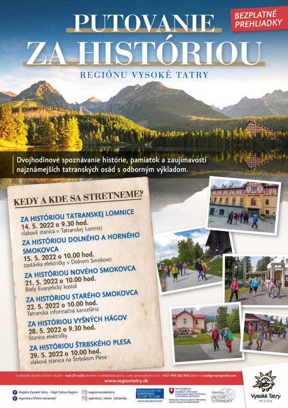 Spoznajte históriu, pamiatky a zaujímavosti najznámejších tatranských osád počas kultúrno – turistickej prechádzky v mesiaci MÁJ s profesionálnou turistickou sprievodkyňou, ktorá trvá približne 2 hodiny. VSTUP NA PUTOVANIE JE VOĽNÝ.