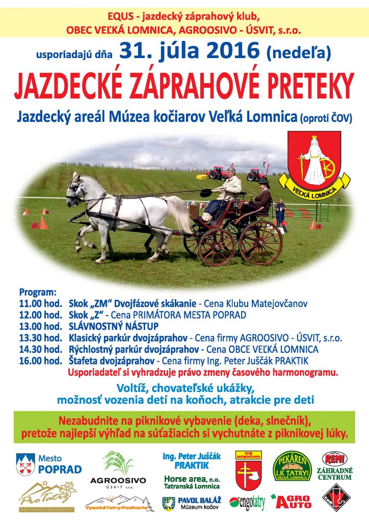 Jazdecký areál múzea kočiarov vo Veľkej Lomnici bude v nedeľu, 31. júla 2016 hostiť JAZDECKÉ ZÁPRAHOVÉ PRETEKY. Štart podujatia je o 11:00 hod.