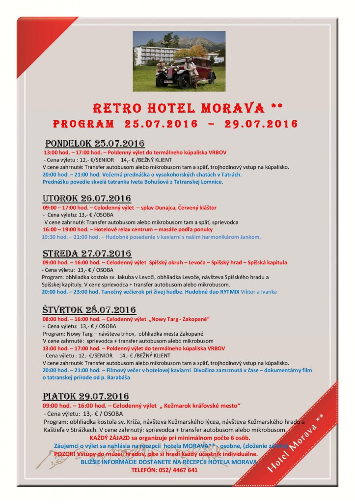 Bezplatne sa ho môžu zúčastniť aj hostia z iných hotelov, okrem fakultatívnych výletov, ktoré sú za poplatok. Rezervácie osobne na recepcii hotela.