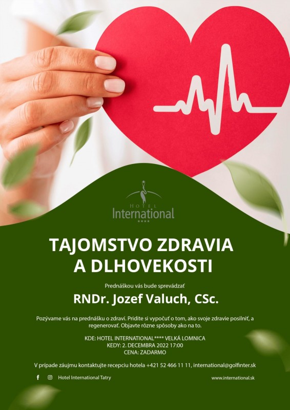 Hotel International pozýva všetkých, ktorí sa zaujímajú o zdravý životný štýl a alternatívne formy prístupu ku zdraviu na prednášku. K téme sa bude vyjadrovať certifikovaný výživový poradca RNDr. Jozef Valuch, CSc. a s návštevníkmi sa podelí o svoje cenné skúsenosti z dlhodobého hladovania, podložené vlastnými výskumnými výsledkami biochemických, hematologických, imunologických parametrov a onkomarkerov, meraných v období liečebného hladovania aj regeneračnej diéty.
