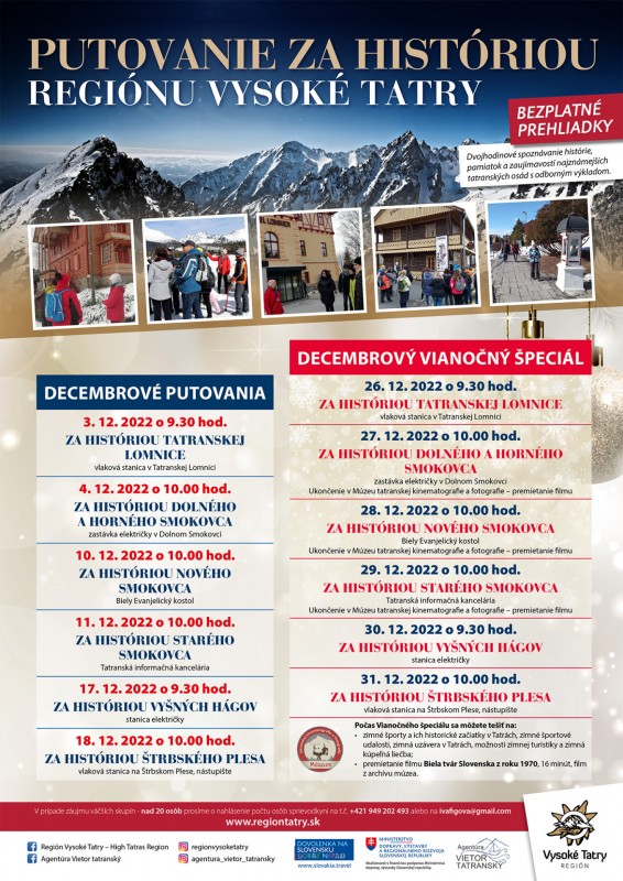 Spoznajte históriu, pamiatky a zaujímavosti najznámejších tatranských osád počas kultúrno – turistickej prechádzky v mesiaci DECEMBER s profesionálnou turistickou sprievodkyňou, ktorá trvá približne 2 hodiny. VSTUP NA PUTOVANIE JE VOĽNÝ.