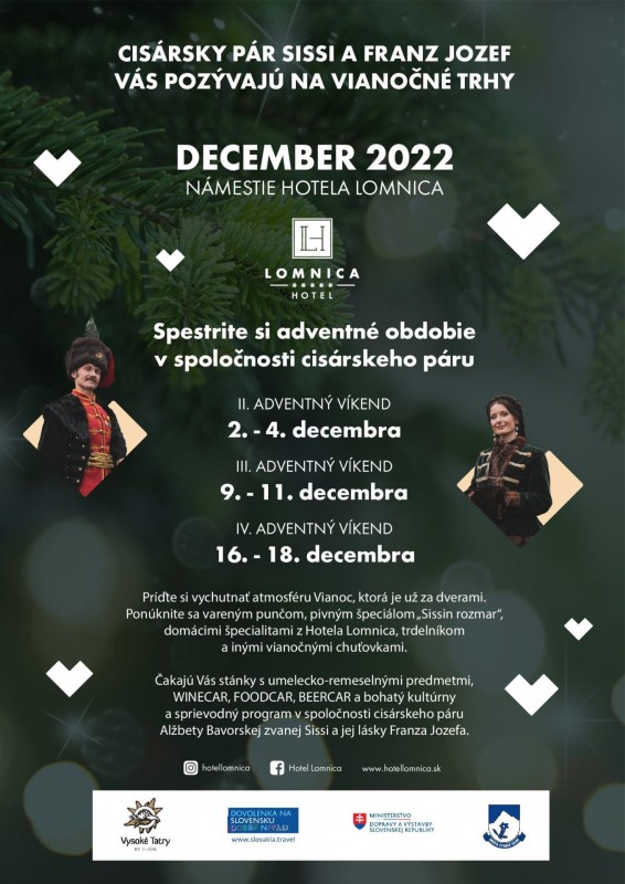 Príďte si vychutnať atmosféru Vianoc, ktorá je už za dverami. Ponúknite sa vareným punčom, pivným špeciálom „Sissin rozmar“, grilovanými a domácimi špecialitami z Hotela Lomnica, trdelníkom a inými vianočnými chuťovkami. Čakajú Vás stánky s umelecko-remeselnými predmetmi, WINECAR, FOODCAR, BEERCAR a bohatý kultúrny a sprievodný program v spoločnosti cisárskeho páru Alžbety Bavorskej zvanej Sissi a jej lásky Franza Jozefa.