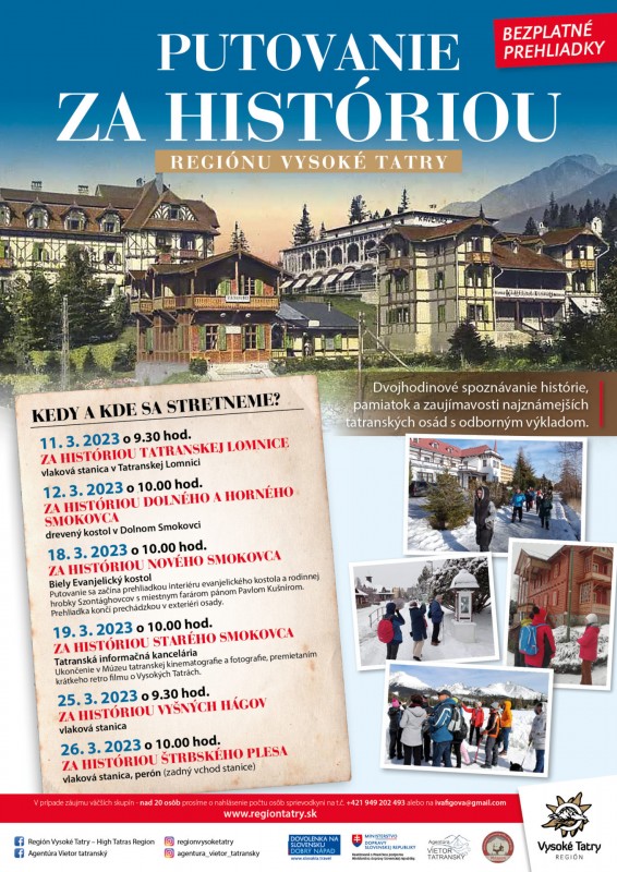 Spoznajte históriu, pamiatky a zaujímavosti najznámejších tatranských osád počas kultúrno – turistickej prechádzky v mesiaci MAREC s profesionálnou turistickou sprievodkyňou, ktorá trvá približne 2 hodiny. VSTUP NA PUTOVANIE JE VOĽNÝ.