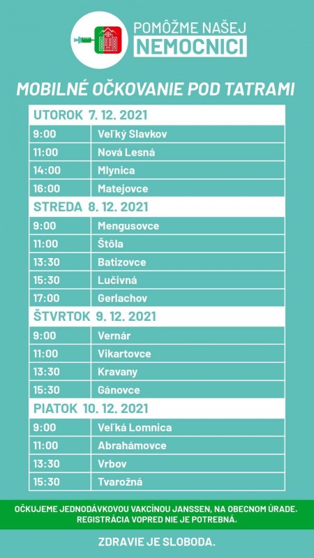 Ak máte v obciach pod Tatrami rodinu, priateľov, známych, či susedov, ktorí nemajú možnosť dostať sa do očkovacieho centra, alebo váhajú s očkovaním, táto informácia je pre vás. Prosíme, zdieľajte termíny mobilného očkovania pre tých, ktorí svojim rozhodnutím pomôžu odbremeniť popradskú nemocnicu.