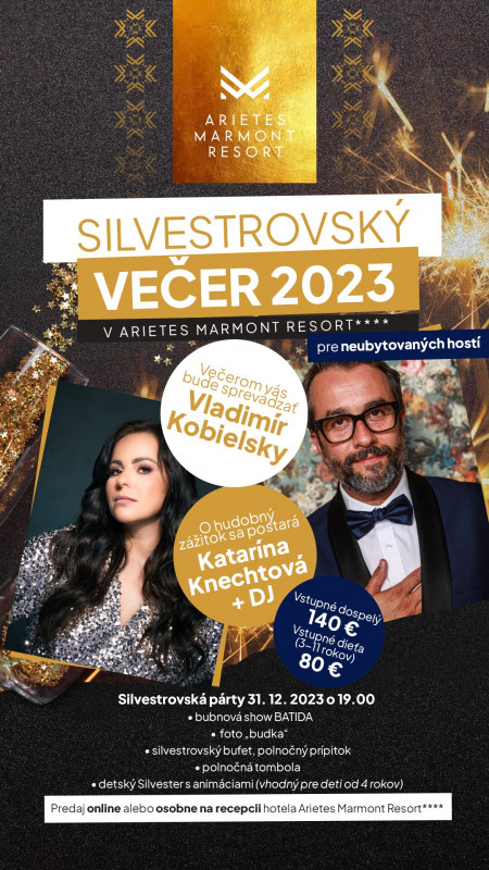 Silvestrovský večer v Arietes Marmont Resort****, ktorým vás bude sprevádzať Vladimír Kobielsky. O hudobný zážitok sa postará Katarína Knechtová + DJ.