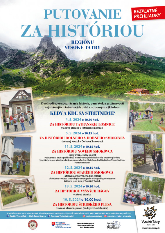 Spoznajte históriu, pamiatky a zaujímavosti najznámejších tatranských osád počas kultúrno – turistickej prechádzky v mesiaci MÁJ s profesionálnou turistickou sprievodkyňou, ktorá trvá približne 2 hodiny. VSTUP NA PUTOVANIE JE VOĽNÝ.