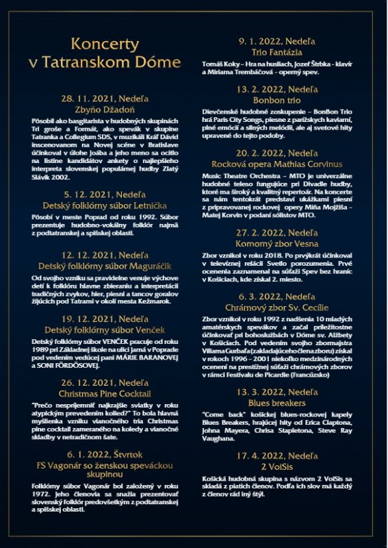 Koncerty v Tatranskom ľadovom dóme si môžete užiť každú nedeľu o 15:00, koncerty sú prístupné už aj pre verejnosť. Samozrejmosťou je respirátor. Koncerty si stále môžete pozrieť aj ONLINE na FB Región Vysoké Tatry – High Tatras Region a Vysoké Tatry – Hory zážitkov .