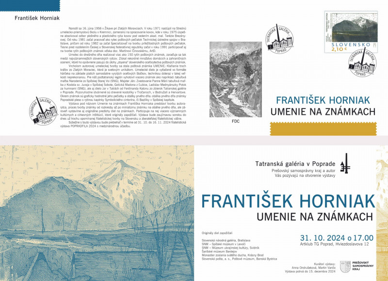 Pozývame Vás na vernisáž výstavy František Horniak UMENIE NA ZNÁMKACH (kurátori výstavy: Dr. Anna Ondrušeková, Martin Vančo) a vernisáž premiérovej filatelistickej výstavy POPRADFILA 2024, ktorá sa uskutoční vo štvrtok 31. októbra 2024 o 17.00 v Tatranskej galérii v Poprade na Hviezdoslavovej 12.