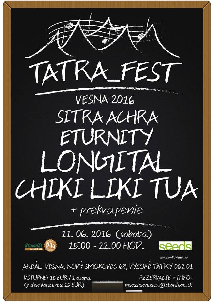 < aktuálny týždeň zľavy na tatrami.sk > V sobotu, 11. júna 2016 sa v areáli penziónu Vesna v Novom Smokovci uskutoční TATRA FEST 2016. Podujatie bude prebiehať od 15:00 do 22:00 hod. Tohtoročný Tatra_Fest privíta: Sitra Achra Eturnity Longital Chiki Liki Tua + prekvapenie Vstupné: 15€ / osoba (aj v deň koncertu). Info a rezervácie na penzionvesna@stonline.sk a www.penzionvesna.sk. publikované: 09.05.2016 Diskusia Please enable JavaScript to view the comments powered by Disqus.